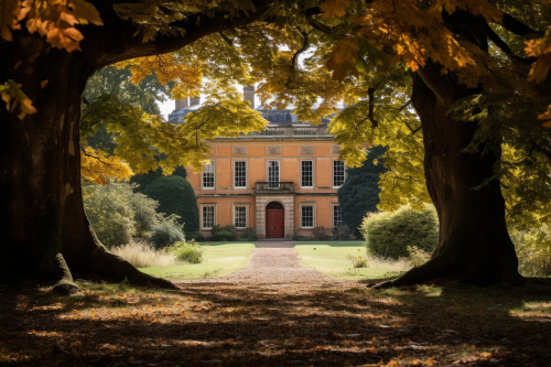 A concept art-style illsutration featuring an 18th-century English manor house and a yong noble in front of us peering the outside through a window.