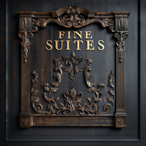 TEXT "FINE SUITES" in an elegant style on a luxurious wooden panel for a luxury tailor shop, intricit details