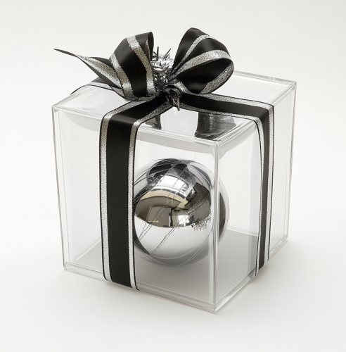 A square, transparent gift box with a silver and black ribbon. Inside the box there is a silver christmas sphere. . It includes two ribbons wrapped around its sides to add visual appeal. White background. --ar 111:112