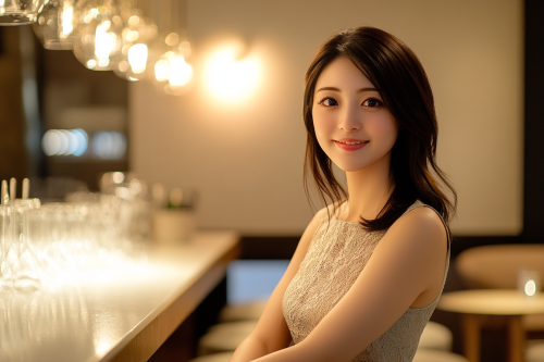 Photo of striking spanish man next to his date,She is smiling at the camera holding a martini with curly voluminous hair, standing at the bar --ar 9:16 --v 6.1