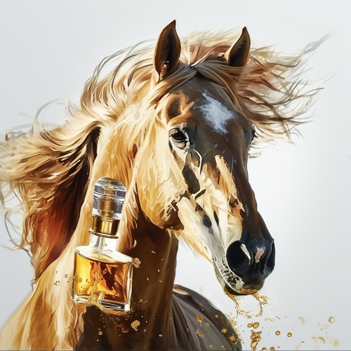 horse whith golden hair in the back perfume bottle in the front, white background, --v 6.0