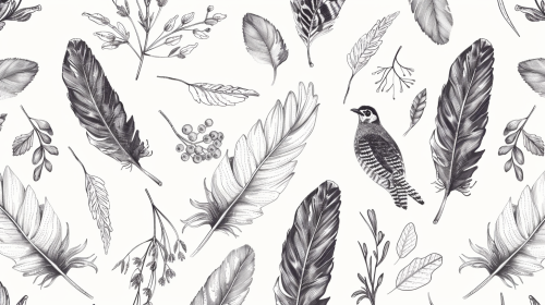 pattern illustration about taking care of your body, line art with feathers and dry plant --ar 16:9