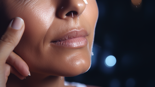 close up shot of a latino woman in her early 50s applying small water drops to her face using a crystal dropper, beauty ad, clean, white background, minimalistic, white lights, cinematic lighting, --ar 16:9