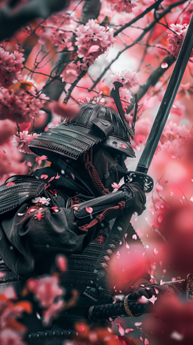 ultra realistic wallpaper of a Japanese ninja holding a sword under the oink color sakura tree. samurai wearing a black color-fitting suit and black color war helmet.nice wallpaper, perfect color balance, nice focused, high-quality eye-catching wallpaper --ar 9:16 --v 6.0