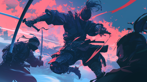 This image is a dynamic and detailed scene that brings together a Japanese samurai and a stealthy ninja, set against a dramatic backdrop filled with cultural and atmospheric elements. The composition is rich with intricate details, capturing a moment that feels both intense and timeless. In the foreground, the samurai stands firm, dressed in a resplendent suit of armor. His armor is adorned with layers of lacquered plates in deep shades of red and black, each piece meticulously engraved with motifs of dragons, cherry blossoms, and swirling clouds. The helmet (kabuto) has a prominent crest in the shape of golden horns, while his face is partially covered by a fierce mask (mempo), showing only his intense eyes that radiate focus and honor. The samurai holds a katana with both hands, the blade gleaming in the soft light, its edge honed to razor-sharp perfection. His stance is solid and composed, embodying discipline and strength as he faces his unseen opponent. To the side and slightly in the shadows, a ninja crouches with quiet intensity. Dressed in dark, fitted clothing that blends seamlessly with the night, the ninja is poised for action, holding a pair of gleaming shuriken (throwing stars) in one hand and a short blade (ninjato) in the other. His face is mostly concealed by a black mask, but his sharp, observant eyes reveal a look of cunning and stealth. The ninja’s form is lithe and agile, ready to disappear into the shadows at a moment’s notice. Small details, like the cloth wraps around his wrists and ankles and the way his outfit flows with his movements, emphasize his stealthy, agile nature. The background is a moonlit Japanese village nestled in a mountainous landscape, shrouded in mist that rolls down from the distant peaks. Traditional wooden houses with [...]