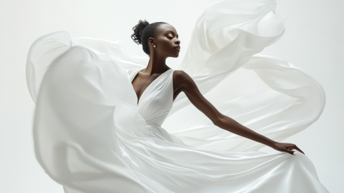 A high-resolution, realistic, dynamic, and cinematic photograph of a model on a runway, wearing an elegant white silk dress with fabric flowing in the air. The image is vibrant, with high contrast, using a sleek and dramatic camera angle that adds a sense of movement. The style is slightly abstract, focusing on the beauty and energy of the fashion moment. --ar 9:16