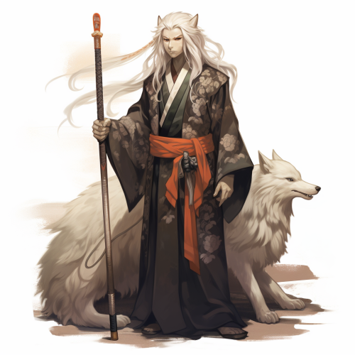 male humaniod kitsune with long white hair in formal japanese military uniform holding cane with one hand