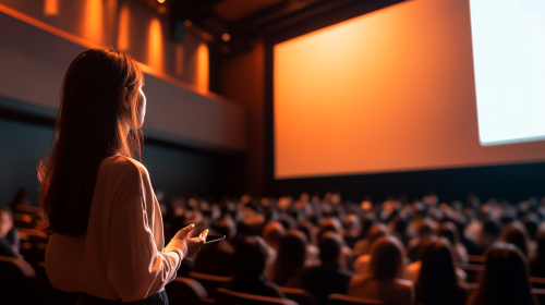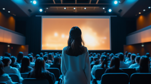 A Korean woman stands in front of a large screen in a big auditorium, presenting to a crowd of people, the glow of the screen casting light on her, focused expressions. Wide-angle shot. photo taken in the style of Canon EOS R5 --style raw --ar 16:9 --v 6.1