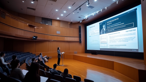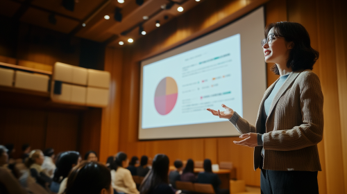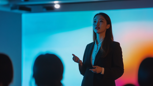 A Korean woman giving a lecture in front of a stunning presentation screen in a large auditorium, professional atmosphere, modern design, well-lit stage, confident and charismatic speaker, engaged audience. --q 2