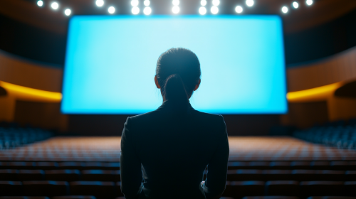 A Korean woman giving a presentation with her back to a big screen on a large auditorium stage, the glow of the screen casting light on her, focused expressions. Wide-angle shot. photo taken in the style of Canon EOS R5 --style raw --ar 16:9 --v 6.1