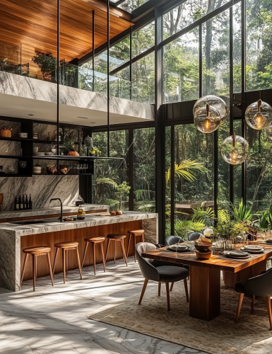 kitchen in the forest, marble and wood living room with glass walls, modern style, natural light from skylights, neutral tones, luxury materials, wooden accents, wall sconces hanging on shelves, large wooden table with modern chairs--the table is set with plantes,glasses,food and candels--on the table there is a chandelier with glass ball handing fro the ceilinglarge, color natural plants, natural rug, natural lighting, natural colors, sunlight through trees, natural atmosphere, modern design, natural materials, warm ambiance, modern interior design --ar 99:128
