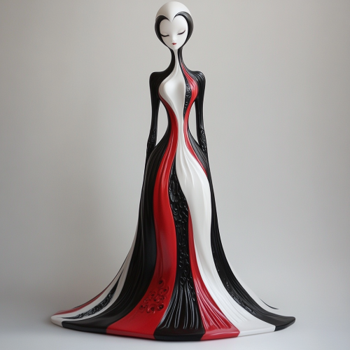 Design a 9-head-tall soft vinyl (sofubi) figure inspired by the sleek elegance and surreal beauty of the character depicted in the provided artwork. The figure should embody a tall, elongated silhouette with graceful proportions, emphasizing the flowing lines of the dress that features striking panels in black, red, and white. The gown should incorporate intricate sculpted patterns that reflect swirling filigree details, creating a dynamic sense of movement, as if the fabric is alive and trailing behind the figure. The face sculpt should have a minimalist, ethereal expression, with soft, stylized features that evoke both mystery and elegance. The character's head and neck should remain elongated, staying true to the surreal proportions of the original illustration. For the dress design, use soft vinyl to replicate the flowing material, adding subtle textures for the ornate patterns in each color section. Ensure the colors have a matte finish with slight weathering, giving the figure an aged and timeless feel. The red, black, and white panels should blend seamlessly with the figure’s slender body, following the organic shapes seen in the original artwork. The background base should reflect the surreal atmosphere of the world the character inhabits--perhaps an abstract representation of flowing vines or gothic arches. The base can include swirling designs, lightly textured surfaces, and organic motifs that complement the gown’s intricate filigree, merging the character with her environment. This soft vinyl figure must embody elegance, surrealism, and fine craftsmanship, staying distinct from Barbie-like aesthetics. It should capture the essence of art toy design, where form, texture, and concept align to create a unique, otherworldly piece that transcends [...]