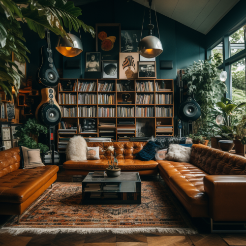 a elegant lounge where friends come to listen to vinyl records together on massive speakers