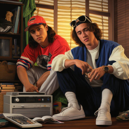 2 male friends sitting in a 1980s bedroom listening to music . One friend is white American with surfer style, and the other friend is half Asian, dressed in trendy clothes