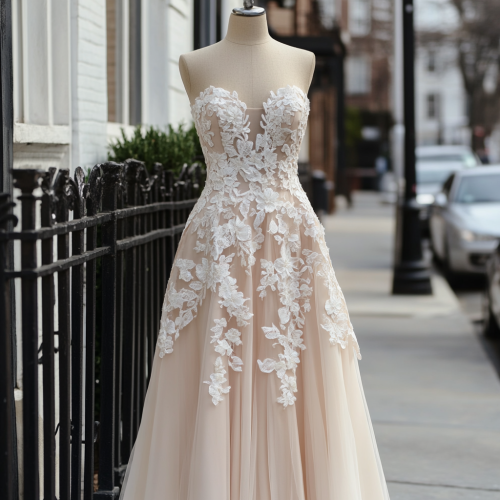 Design a romantic, modern bridal gown in a soft blush or ivory hue with a strapless sweetheart neckline and a flowing A-line silhouette. The dress is embellished with delicate floral lace appliqués, creating a semi-sheer effect on the bodice and skirt, with a high slit adding a touch of allure. The setting is an upscale urban street with classic white townhouses and black iron railings, exuding a sophisticated yet casual vibe. The gown is displayed on a mannequin , and the lighting is soft and natural, casting a warm glow that highlights the intricate lace details and the airy elegance of the gown.