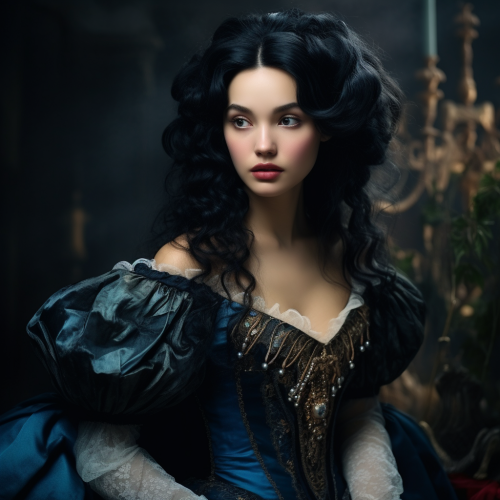 17th century woman in elegant gown. black hair. blue eyes. fantasy aesthetic