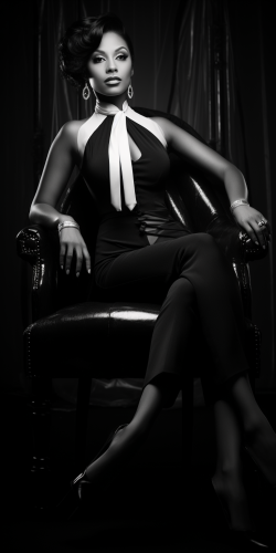 The black and white photograph portrays a captivating scene, featuring a stylish woman posing with confidence while seated on an elegant chair. The monochromatic image highlights the timeless beauty and sophistication of the subject. The woman exudes grace and poise, captivating the viewer with her striking presence. The chiaroscuro lighting adds depth and dimension, accentuating the contours of her face and emphasizing her features. The chair itself is a work of art, with its intricate design and ornate details. Positioned in the foreground, it serves as a regal seat for the woman, enhancing the overall composition. The simplicity of the black and white palette further enhances the timeless elegance captured in this enduring image. --ar 1:2