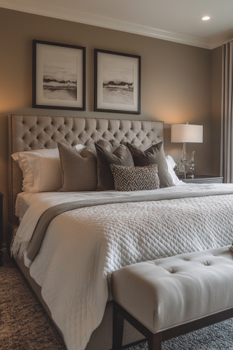 Design a grand master bedroom that combines timeless luxury with modern sophistication, reflecting the style of a young millionaire. The room should feature floor-to-ceiling arched windows, mirroring the exterior facade of the mansion, allowing natural light to flood the space. These windows offer stunning views of the private garden or surrounding estate. The frames of the windows are finished in dark wood with intricate gold detailing, giving a sense of classical grandeur while maintaining the modern aesthetic. The centerpiece of the room is a large, four-poster bed, with intricately carved dark wood posts and a headboard upholstered in rich velvet, either in a deep navy, emerald green, or royal purple. The bed is adorned with plush, high-thread-count linens in crisp white, accented by a luxurious throw and cushions in coordinating colors with subtle gold embroidery. Above the bed, a chandelier made of cascading crystals and gold accents hangs, casting a soft glow that complements the room’s natural lighting. The ceiling should be coffered, with subtle gold-leaf detailing between the panels, adding a touch of opulence without overwhelming the space. Around the perimeter of the room, crown molding in light tones, with intricate gold inlay, runs seamlessly from wall to ceiling, enhancing the overall sense of elegance. The flooring is a continuation of the warm, polished wood found in other areas of the mansion, with a hand-tufted rug placed under the bed for added warmth and texture. The rug should be a soft ivory or beige, with an elegant but understated pattern that complements the luxurious feel of the space. Opposite the bed, there is a grand fireplace, framed in white marble with gold veining, with an ornate mirror hanging above it. On either side of the [...]