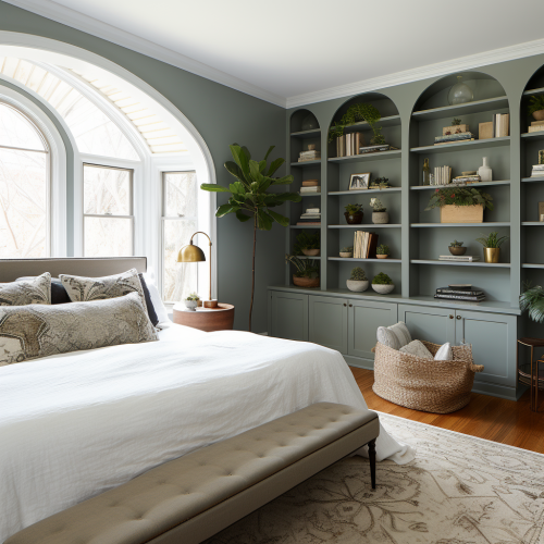 design a cozy, casual master bedroom with built in, arched bookcases painted sherwin williams pewter green 6208, hex code 5E6259, in nate berkus style with a small window 8k. camera angle directly facing bookcases- --v 5.2