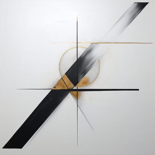 elegant minimalist abstract geometric painting, black ,silver and gold colors, simple lines, sword and emblem.