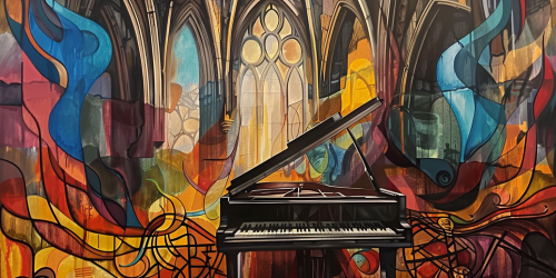 violent cathedral piano emotion explosion, historical oil paint with celtic tracery by picasso --ar 2:1