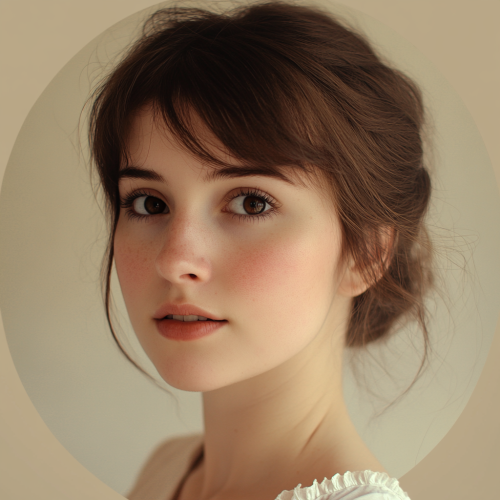 portrait of a twenty year old woman. The woman has an oval face with symmetric facial structures, doe-like, she has dark eyes, brown hair, a Greek nose, a small rosebud mouth and fair white skin. She blushes. Jane Austen style, realistic photo.