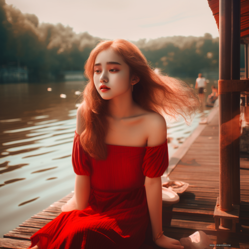 A girl in a red dress on a dock, with her hair blowing, in the style of realistic color palette, gongbi, portraits with soft lighting, video montages, childlike, cute and colorful, realistic --v 5.0