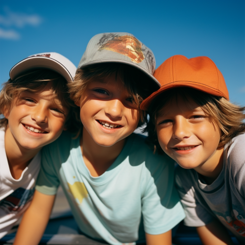 3 boys with ten-years-old showing your plain and basic truck caps, super close-up, showonly the boys caps, sunny day, bright day scenario, happycore, different positions, bright and colorful colors, kid core, The child is in the midst of her journey, displaying joy and curiosity, Cinematic, Photoshoot, Shot on 25mm lens, Depth of Field, Tilt Blur, Shutter Speed 1/1000, F/22, White Balance, 32k, Super-Resolution, Pro Photo RGB, Half rear Lighting, Backlight, Dramatic Lighting, Incandescent, Soft Lighting, Volumetric, Conte-Jour, Global Illumination, Screen Space Global Illumination, Scattering, Shadows, Rough, Shimmering, Lumen Reflections, Screen Space Reflections, Diffraction Grading, Chromatic Aberration, GB Displacement, Scan Lines, Ambient Occlusion, Anti-Aliasing, FKAA, TXAA, RTX, SSAO, OpenGL-Shader’s, Post Processing, Post-Production, Cell Shading, Tone Mapping, CGI, VFX, SFX, insanely detailed and intricate, hyper maximalist, elegant, dynamic pose, photography, volumetric, ultra-detailed, intricate details, super detailed, uplight