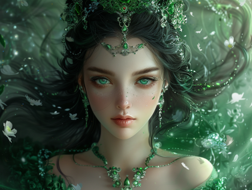 A super exquisite cartoon illustration , a very beautiful goddess , beautiful and elegant atmosphere , exquisite jewelry , beautiful costumes , White and Green , panorama , masterpiece , best quality , UHD , 4K --ar 4:3 --s 300 --v 6.0 --style raw