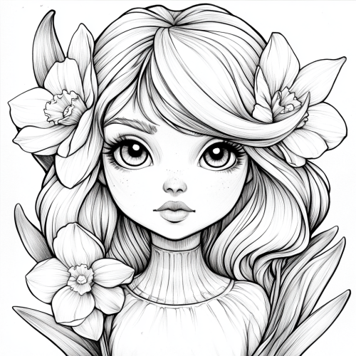 coloring page for kids,Pixar animation, Goddess character,Personification of a Daffodil, thick line, low detail, Lines only with no shadow color, by Margaret Keane,Tim Burton, Mark Ryden