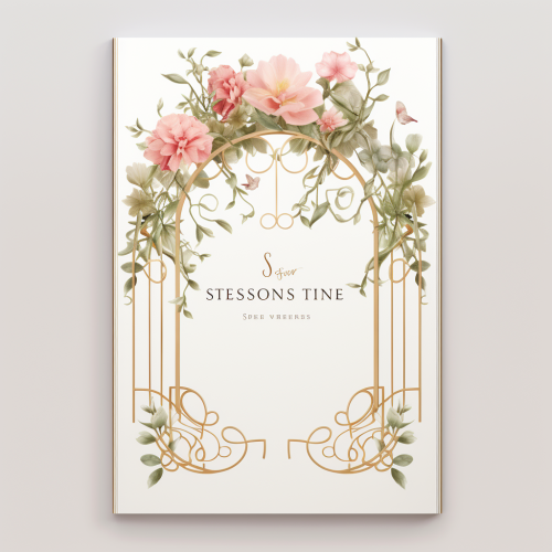 wedding invitation card with a gate that has as little floral as possible at the edge, gold accents, centered elegant text on a white background