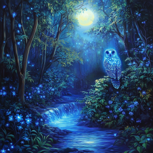 A tranquil forest scene at twilight with a glowing river flowing through the center. The trees are adorned with bioluminescent flowers, and a full moon peeks through the dense foliage. A glowing owl with intricate feather patterns perches on a branch. Ethereal, mystical art style, soft light blending into shadows. --ar 1:1