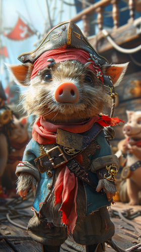 Cartoon Style: A fashion show on a pirate ship's deck featuring an adventurous baby piglet in pirate hats and gear, posing with a treasure map, while animal pirates drawn in caricature applaud around --ar 9:16 --s 750 --v 6.0