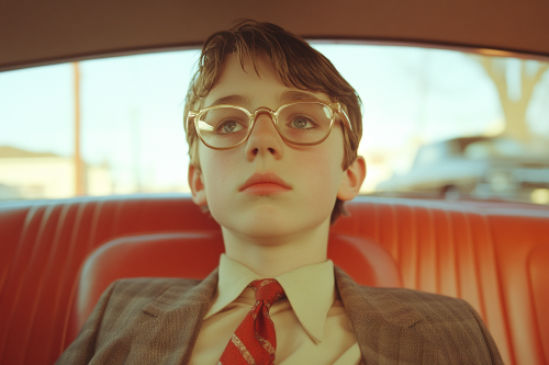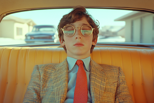 1994, wide shot interior car, Wes Anderson style, symmetry, nerdy teenage boy wearing school blazer shirt and tie, sitting in back of car, frontal, color film --ar 3:2 --style raw --s 250