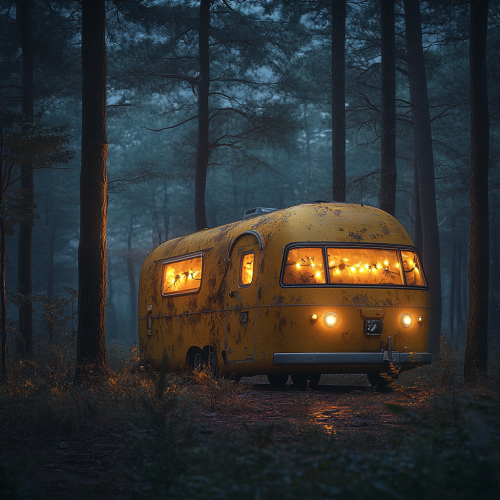 cinematic photograph of a american vintage camper at dark night in the style of wes anderson , in the style of hyperrealistic photography --s 750 --style raw