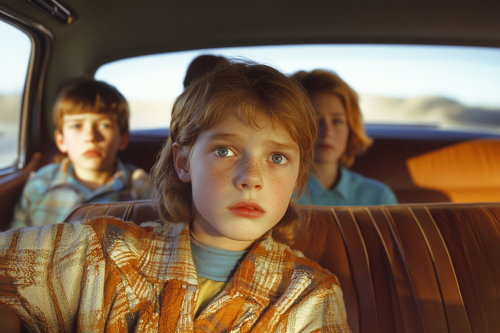 1994, dynamic wide lens shot interior car, Wes Anderson style, symmetry, Mom and Dad look in rearview mirror at nerdy son sitting in back of car, frontal, color film --ar 3:2 --style raw --s 250