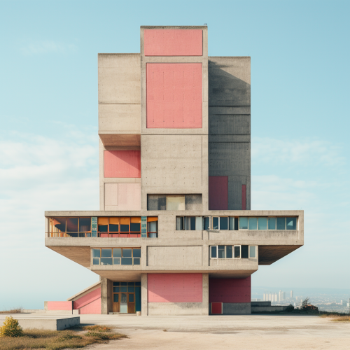 cinestill from a wes anderson movie: a colourful laboratory building is located on a dull street between 2 high grey office buildings, shot from across the street, Wes Andersson style --ar 16:9 --s 750 --style raw