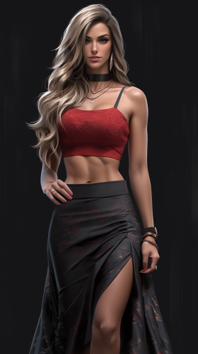 beautiful woman, long straight dirty blonde hair, straight hair, heavy eye makeup, full body pose, self - confident, dangerous and evil, deadly and lethal, beautiful makeup, vibrant smile, beautiful and supermodel woman, skinny, tiny waist, impressive and apparent chest, piercing eyes, high contrast, hyperdetailed, curvaceous body, expression of the body, style of Frank Frazetta, Guilliem March, J Scott Campbell, Michael Turner, and Adam Hughes, decadent picture, --ar 9:16 --stylize 250 --niji 5