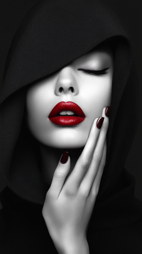 A striking black and white portrait of a woman who exudes elegance and mystery. Her skin is soft and porcelain, contrasting strongly with her dark and bright red lips that are slightly separated, adding a feeling of charm. Her eyes are almost closed, with long and delicate eyelashes that cast subtle shadows on her eyelids. She wears an elegant hood that gracefully covers around her head, framing her face and emphasising her sharp and sculpted features. Her dark and blunt bangs fall perfectly on her forehead, adding a dramatic and modern touch. One hand is delicately raised towards his face, her fingers relaxed and balanced, with pink nails that match the monochrome theme. The whole composition is minimalist but intense, creating a captivating atmosphere of sophistication and mystery, photorealistic --ar 9:16 --style raw --v 6.1