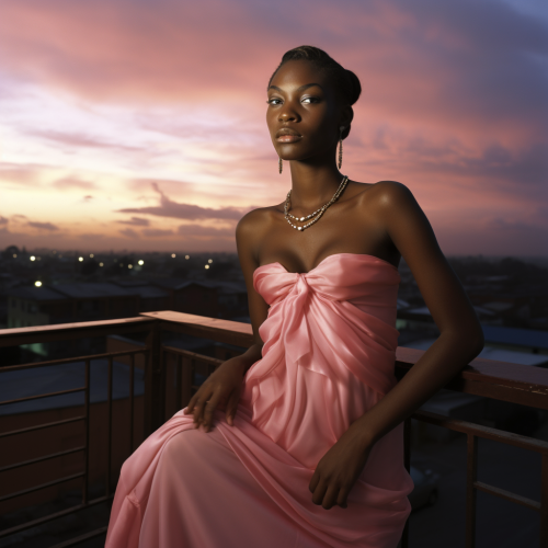 photograph of young African woman on a rooftop at twilight. She is wearing a pink strapless dress and a pearl necklace, with an elegant demeanor. The background features a soft sunset sky and silhouetted cityscape, likely signaling the end of the day.
