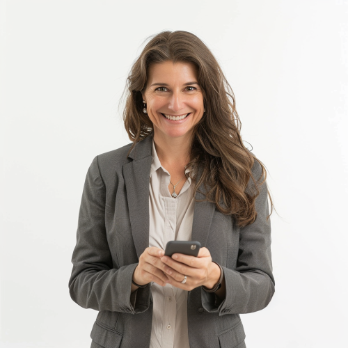 A photorealistic independent Woman 30 to 35 years old, very positiv and smiling infront of a white backdrop, looking very motivated and seems to be very confident in a business casual look, she is holding a phone in her hands and looking at it. she seems very satisfied. high realistic photo taken in a proffesional Photostudio. very clear and crisp appearance, exposure time 125 sec. to 250 sec. ISO 100 to 200, aperture 8,