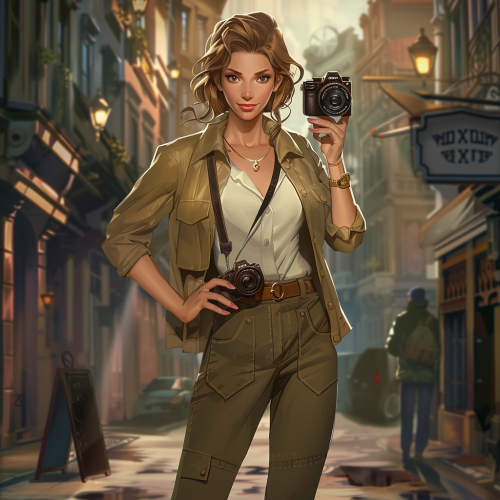 A 45 degree low angle shot in the city of a beautiful 40 year old woman, talking, who is a model and wears elegant but casual and trendy clothes, with vibrant green colors on the street during the day, has purple nails, midday , natural light, shot with a Sony A7S III, 18mm f/1.4 lens, vibrant colors --s 750 --v 6.0