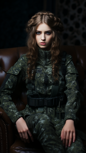 photo samyang af 14mm f/ 2. 8 rf 20 years old blonde woman lace aristocracy military uniform green grey colour feminine full-length --relax --ar 9:16