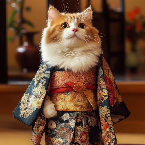 Crie uma imagem de um gato persa vestido com um kimono elegante. O kimono deve ser detalhado, com padrões tradicionais e cores vibrantes, como vermelho, dourado e azul, refletindo o estilo clássico japonês. O gato deve estar posado de forma majestosa, com seu pelo volumoso e macio visivelmente em harmonia com a fluidez do kimono. O fundo deve ser um ambiente sereno e sofisticado, como um jardim japonês ou uma sala de estilo tradicional, para complementar a estética do kimono e criar uma cena harmoniosa e elegante