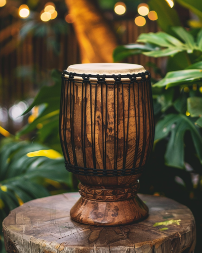Eine prächtige Conga aus hochwertigem Holz, prominent im Vordergrund positioniert, mit feinen Details, die durch gezielte Beleuchtung hervorgehoben werden. Der Hintergrund ist retro Boho Africa Hippie Stil, jedoch subtil und unscharf, um den Fokus auf die Conga zu legen. Das Bild hat warme Töne und ist in hoher Auflösung, mit besonderer Betonung auf der Eleganz und Qualität des Instruments --ar 4:5 --v 6.0 --style raw