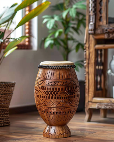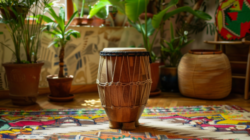 Eine elegante Conga aus glänzendem Holz, im Mittelpunkt eines retro Boho Africa Hippie Raumes, umgeben von warmen, erdigen Farben. Die Conga steht auf einem kunstvoll gewebten, bunten Teppich. Der Hintergrund zeigt Textilien und Deko-Elemente im Ethno-Stil, mit sanfter, natürlicher Beleuchtung, die eine gemütliche Atmosphäre schafft --ar 4:5 --v 6.0 --style raw