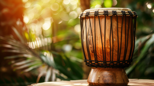 Eine hochwertige Conga aus poliertem, edlem Holz, perfekt ausgeleuchtet und im Zentrum des Bildes platziert. Die feinen Details der Holzmaserung und der Trommelhaut sind deutlich sichtbar. Der Hintergrund ist im retro Boho Africa Hippie Stil gehalten, jedoch dezent und leicht unscharf, um die Aufmerksamkeit vollständig auf die Conga zu lenken. Warme Farben, hochauflösend, Fokus auf Qualität --ar 16:9 --v 6.0 --style raw