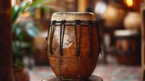 Eine exquisite Conga, gefertigt aus edlem Holz, steht im Mittelpunkt des Bildes und nimmt den Großteil des Bildfokus ein. Die Details der Handwerkskunst sind scharf und klar dargestellt. Der Hintergrund ist retro Boho Africa Hippie Stil, jedoch verschwommen und in warmen Tönen gehalten, um die hochwertige Conga hervorzuheben. Sehr hochauflösendes Bild, perfekte Ausleuchtung --ar 4:5 --v 6.0 --style raw