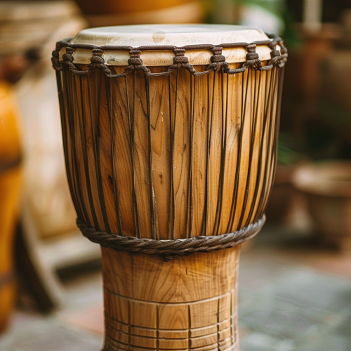 Eine edle Conga aus massivem, poliertem Holz, im Fokus des Bildes. Die Trommelhaut und die Holzmaserung sind detailliert und klar sichtbar, mit einer Beleuchtung, die die Hochwertigkeit des Instruments betont. Der Hintergrund ist im retro Boho Africa Hippie Stil, aber absichtlich unscharf gehalten, um den visuellen Schwerpunkt auf die Conga zu legen. Sehr hochauflösend, warme Atmosphäre --ar 1:1 --v 6.0 --style raw