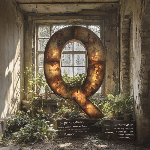 "Ein großes, rostendes Q mitten in einem verlassenen, überwucherten Raum, umgeben von zerbrochenen Fenstern und verfallenen Mauern, Lichtstrahlen fallen durch die Risse und erleuchten den verrosteten Buchstaben, Pflanzen und Moos überwuchern das Q und wachsen entlang der Risse im Boden, symbolisch für den langsamen Verfall und das Überwuchern einstiger Ideen, Atmosphäre ruhig und geheimnisvoll." --s 750